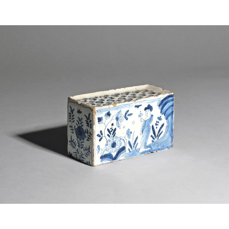 A delftware flower brick c.1750, possibly Lambeth, the rectangular form painted in blue to each long side with a Chinese lady holding a single flower beside flowering plants, the shorter sides with flowering mimosa sprays, the top pierced with seven even rows of three holes with blue stars between, blue 4 mark to the underside, some chipping, 15.7cm across.