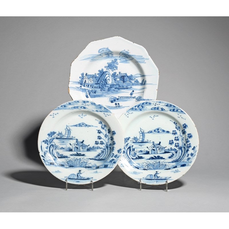 A pair of Bristol delftware plates mid 18th century, painted in blue with a figure in a boat before a low hut on an island, a further sailing boat in the background, and a large octagonal plate painted with a solitary figure fishing beside a low fence, before an island village scene, two dash marks on the reverse, some rim damages, 26.5cm max. (3)