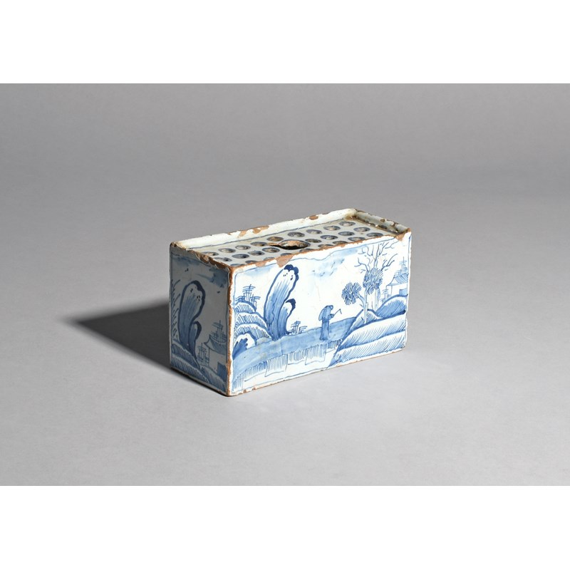 A large delftware flower brick c.1760, probably Liverpool, painted in blue with a small figure fishing in a landscape containing trees and bold rockwork, the landscape echoed to the shorter sides, the recessed top pierced with 26 small holes arranged in rows either side of a larger circular opening, some chipping, 17.3cm across.