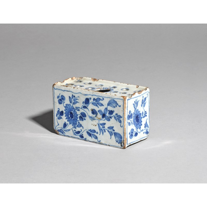 A small delftware flower brick c.1750, the rectangular form painted with flowering mimosa sprays to all four sides, the recessed top pierced with an arrangement of 18 small holes around a central circular aperture, some chipping, 11.5cm across.