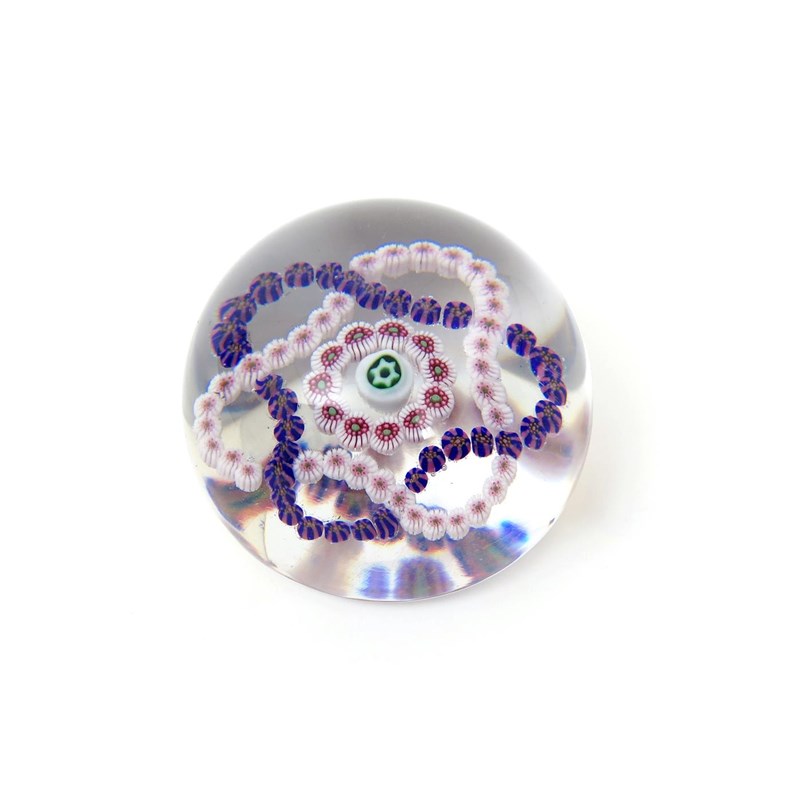 A French glass paperweight c.1860, enclosing a garlanded design of two overlapping strings of canes around a small ring and star cane, 7cm.