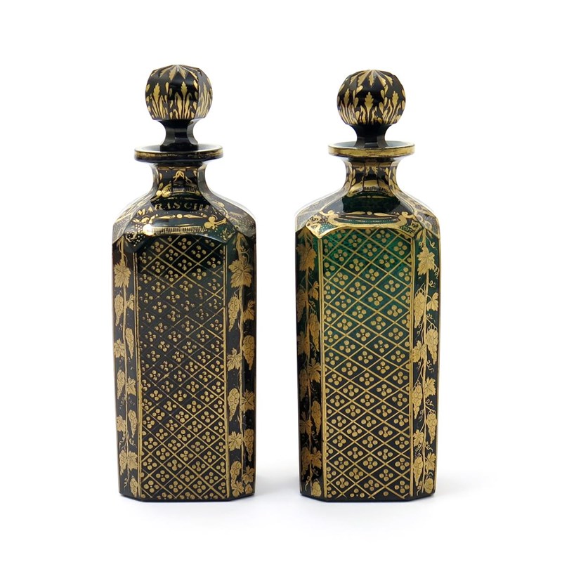 A pair of green glass spirit decanters and stoppers late 18th/early 19th century, the square forms with chamfered corners, richly decorated in gilt with alternating panels of flowerhead diaper and fruiting grapevine, one titled 'Maraschino' the other 'Curaço', the globular stoppers faceted, a little wear, 23cm. (4)