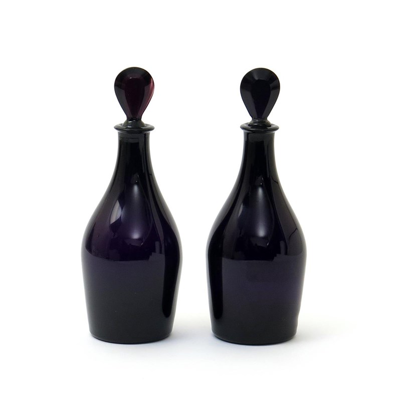 A pair of amethyst glass decanters and stoppers c.1800, of club shape with flattened oval stoppers, the glass a rich purple hue, 23.4cm. (4)