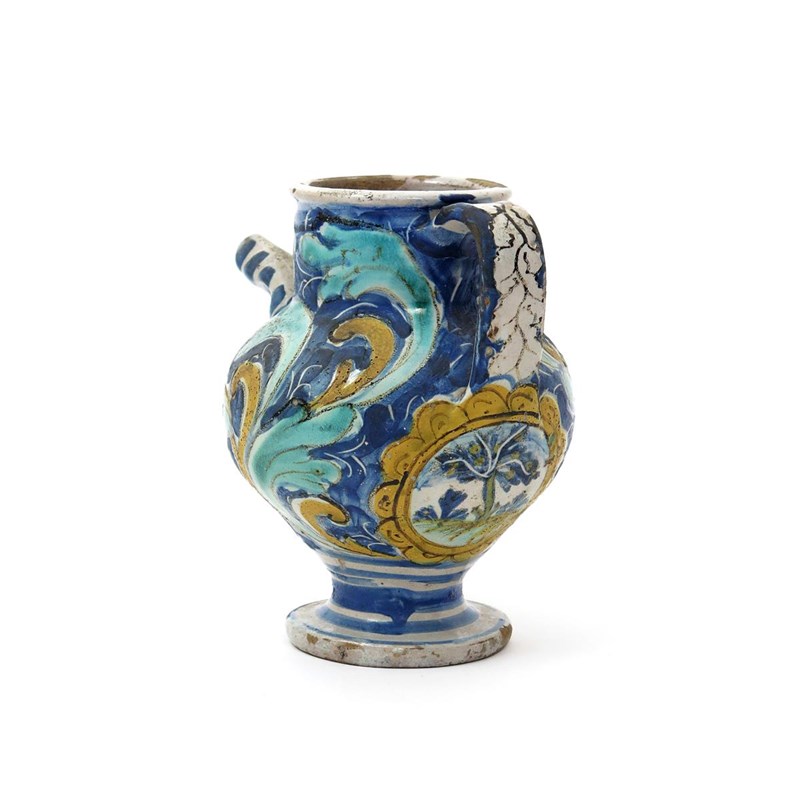 A Caltagirone syrup or wet drug jar c.1700, beneath the wide strap handle painted with a circular panel enclosing a fruit tree, a large white flowerhead beneath the curved spout, reserved on a ground of large stylized scrolling leaves, 21cm.