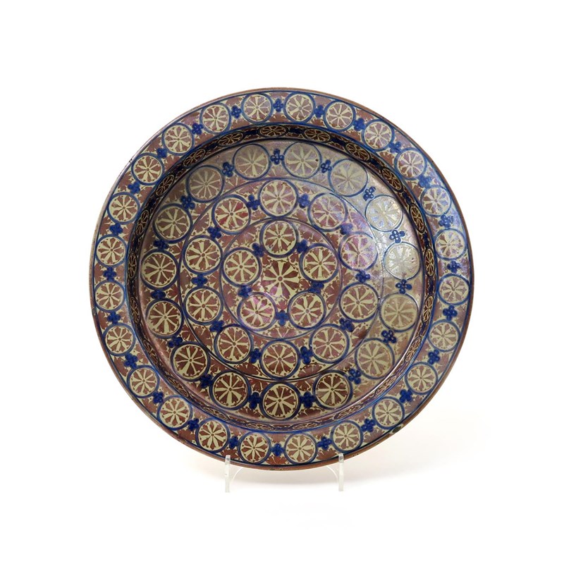 A large Hispano-Moresque deep dish 19th century, decorated in copper lustre and blue with bands of concentric circles containing flowerheads, the underside with bands of copper lustre, 46.7cm dia.