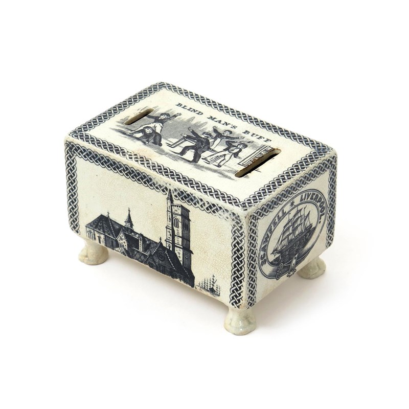 A pearlware rectangular moneybox 2nd half 19th century, the top printed in black with boys playing Blind Man's Buff, the long sides with a view of a church, the shorter with tea clippers titled 'Scawfell Liverpool' and 'Warrior Stockton', raised on four paw feet, the top pierced with two differently sized apertures, 12.5cm across.