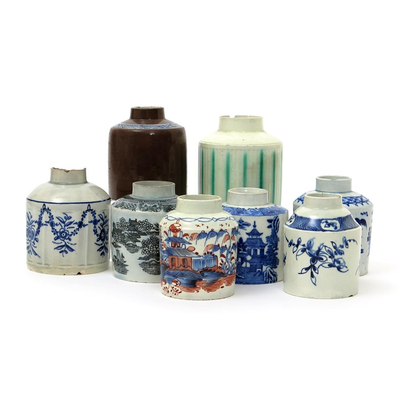Seven pearlware and creamware tea canisters early 19th century, all of cylindrical form and variously decorated, two painted in blue with flowers, two with a Chinese landscape, one with later red enamelling, two printed with pagoda landscapes, one with green stripes, the last with a blue hatched band on a brown ground, the covers lacking, chipping, 11cm max. (8)