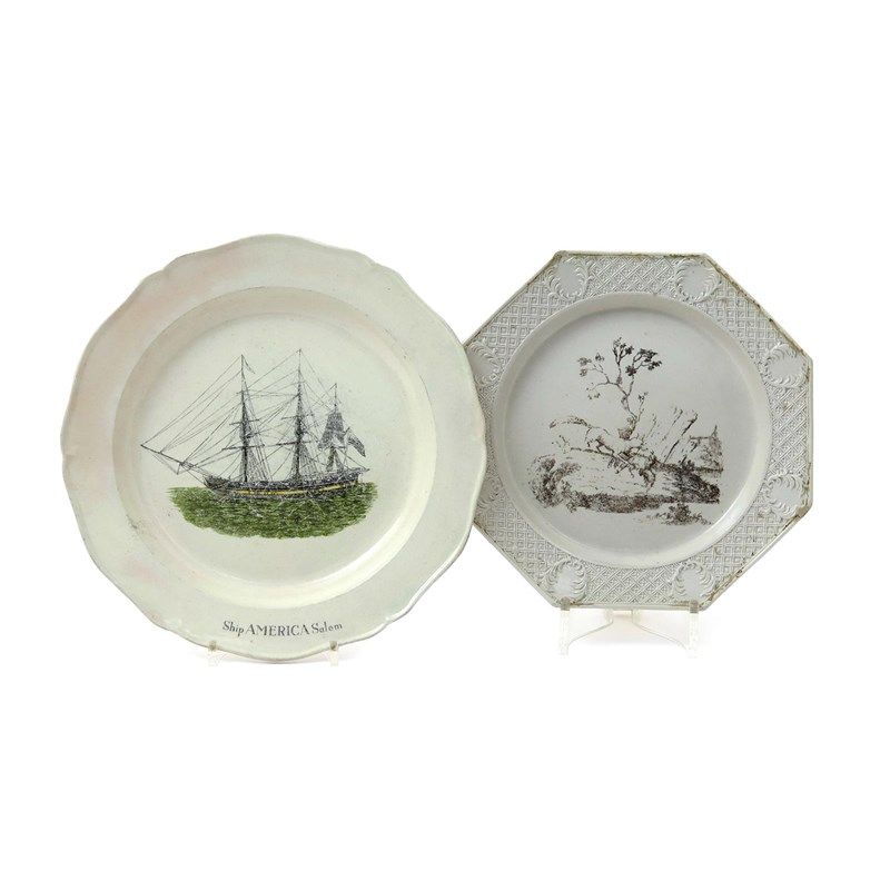 A creamware ship subject plate early 19th century, printed and coloured with a three masted clipper, titled 'Ship America Salem', and a salt-glazed stoneware octagonal plate, printed in black with a fox attacking a hen, the rim moulded with diaper panels, some rim faults, 25cm max. (2)