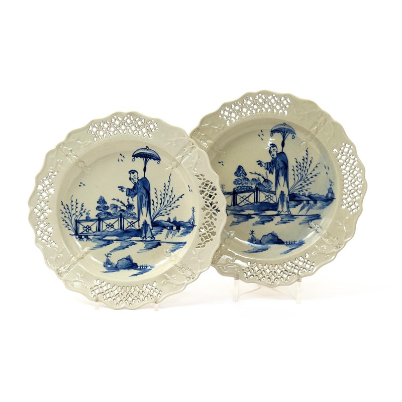 A pair of Leeds Pottery creamware plates early 19th century, each painted in blue with a tall Chinese man standing before an ornamental fence and holding a parasol, the shaped rims pierced with four panels and moulded with foliate motifs, impressed marks, 24cm. (2)