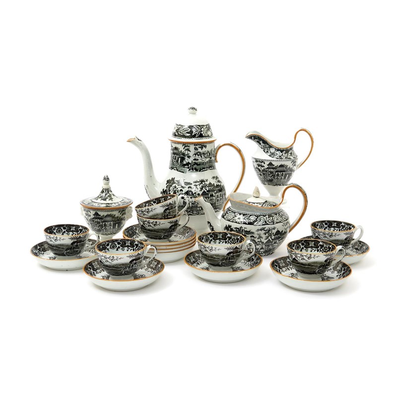A pearlware part tea and coffee service 19th century, printed in black with figures in an Eastern landscape scene, beneath wide floral borders with ochre line rims, some damages. Comprising: a coffee pot and cover, a teapot and cover, a sucrier and cover, a milk jug, seven teacups and nine saucers. (23)