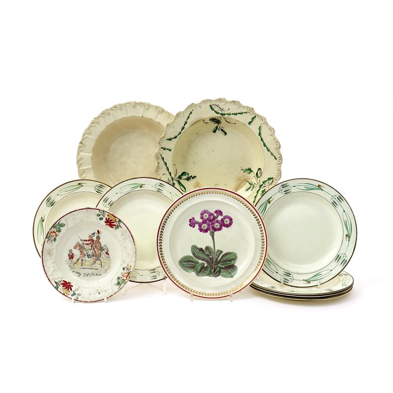 Ten creamware plates late 18th/19th century, six Wedgwood and painted with a stylized border of barley, one botanical and painted with a specimen of Purple Auricula, two soup plates with feather-moulded rims, the last a nursery plate with moulded border, printed with a scene from Dr Syntax, some damages, 24.5cm max. (10)