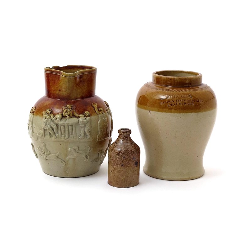 A brown stoneware jug and a jar 19th century, the jug sprigged in high relief with various scenes of topers above a continuous stag hunt, the jar of baluster form and impressed 'John Hill, Cannon Fixture Dealer, 3 to 7 New Cut', and a small salt-glazed stoneware bottle with a mottled glaze, some rim chips to the jug, 20cm max. (3)