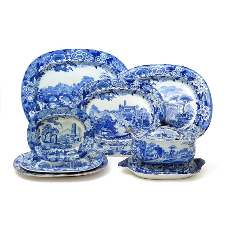 A Don Pottery blue and white transferware soup tureen with cover and stand 19th century, and six matching meat dishes or chargers in various sizes, all printed with views from the Named Italian Views series, including Cascade at Isola, View of Corigliano, Residence of Solimene and The Church of Resina, 54cm max. (9)