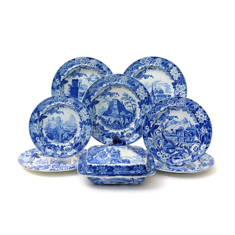 A blue and white transferware tureen and cover and seven dishes 1st half 19th century, probably Don Pottery including the Named Italian Views series, variously printed with figures and buildings in landscapes within wide floral bands, including 'Near Taormina' and 'Obelisk of Catania', 25cm max. (9)