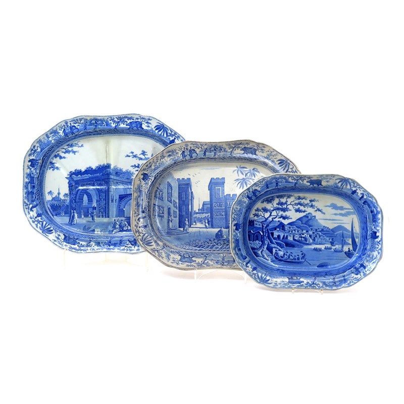 Three Spode blue and white transferware meat dishes or chargers from the Caramanian Series 19th century, one printed with a view of the Castle of Boudron, one with the Principal Entrance of the Harbour of Cacamo, the largest with the Triumphal Arch of Tripoli in Barbary, moulded with draining channels, printed Spode marks, one chipped, 52cm max. (3)