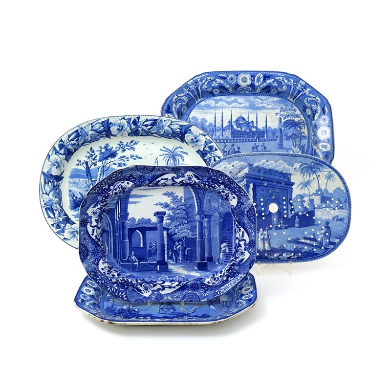 Four blue and white transferware meat platters 1st half 19th century, two Don Pottery from the Ottoman Empire series, another Copeland Spode, and an oval strainer, all decorated with scenes of figures in Eastern landscapes within floral borders, some faults, 48cm max. (5)