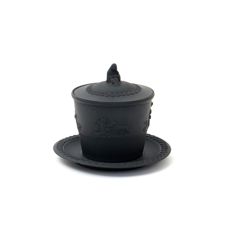 A black basalt sucrier with cover and stand early 19th century, the flared sides sprigged with scenes of putti and other figures above a band of dense vertical fluting, the saucer and cover with a continuous floral medallion band, the cover surmounted with a sibyl finial, 14.8cm across. (3)