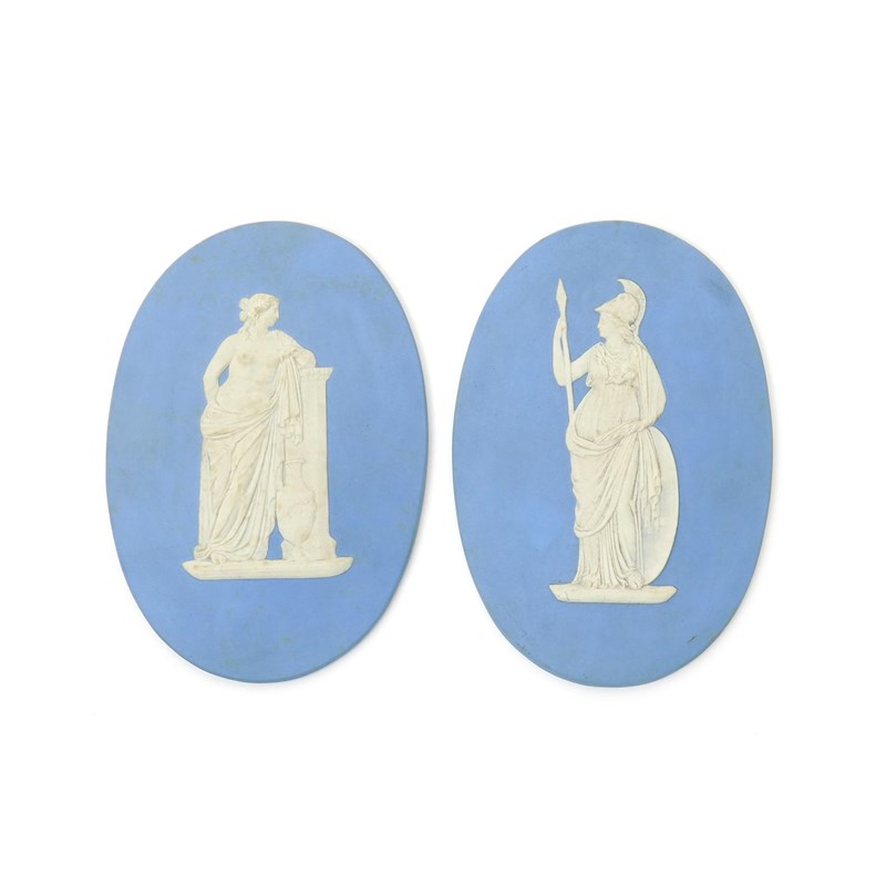 A large pair of Wedgwood Jasperware oval plaques 19th/early 20th century, one applied with a Classical maiden leaning on a tall pillar beside a vase, the other with a Classical warrior maiden holding a spear, in white reserved on a blue ground, impressed marks, 21cm. (2)