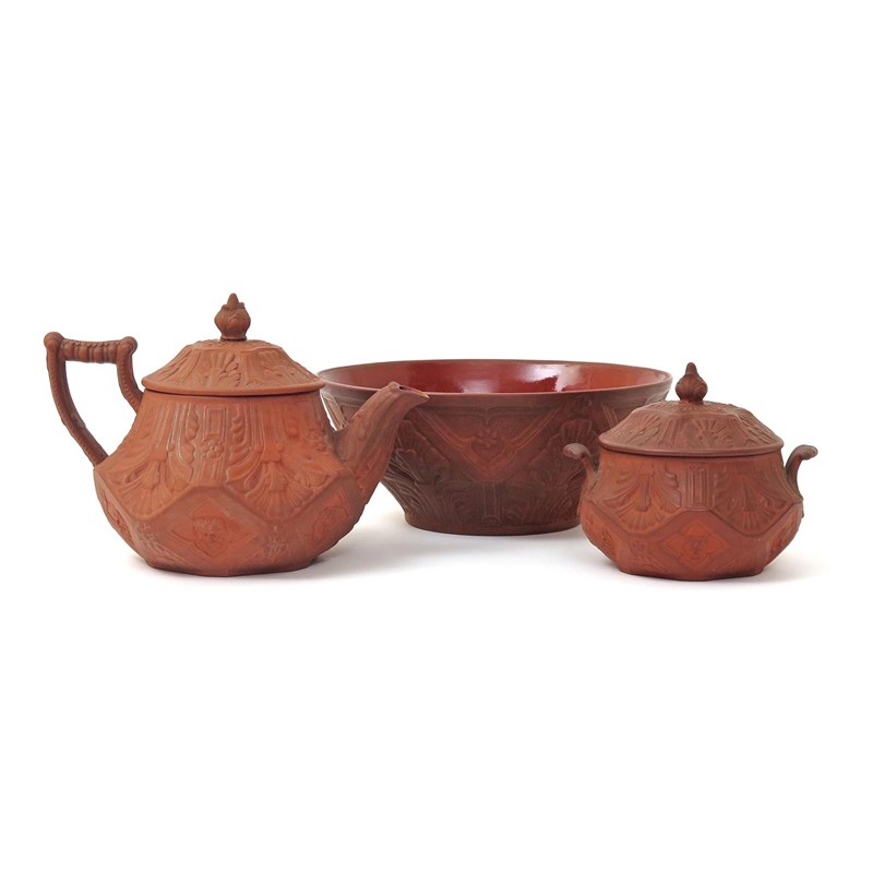 A Wedgwood Antico Rosso part tea service 19th century, moulded with formal foliate motifs around Bacchus mask panels, impressed marks. Comprising: a teapot and cover, a sucrier and cover and a slop bowl. (5)