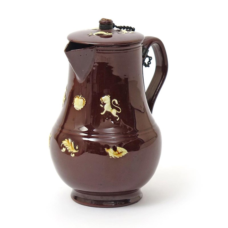 A Staffordshire glazed redware jug and cover c.1745, sprigged with the Lion and the Unicorn of the Royal Coat of Arms either side of a crown, decorated in cream slip on a rich treacle ground, a chain linking the cover and handle, some chipping to the cover, 14cm. (2)
