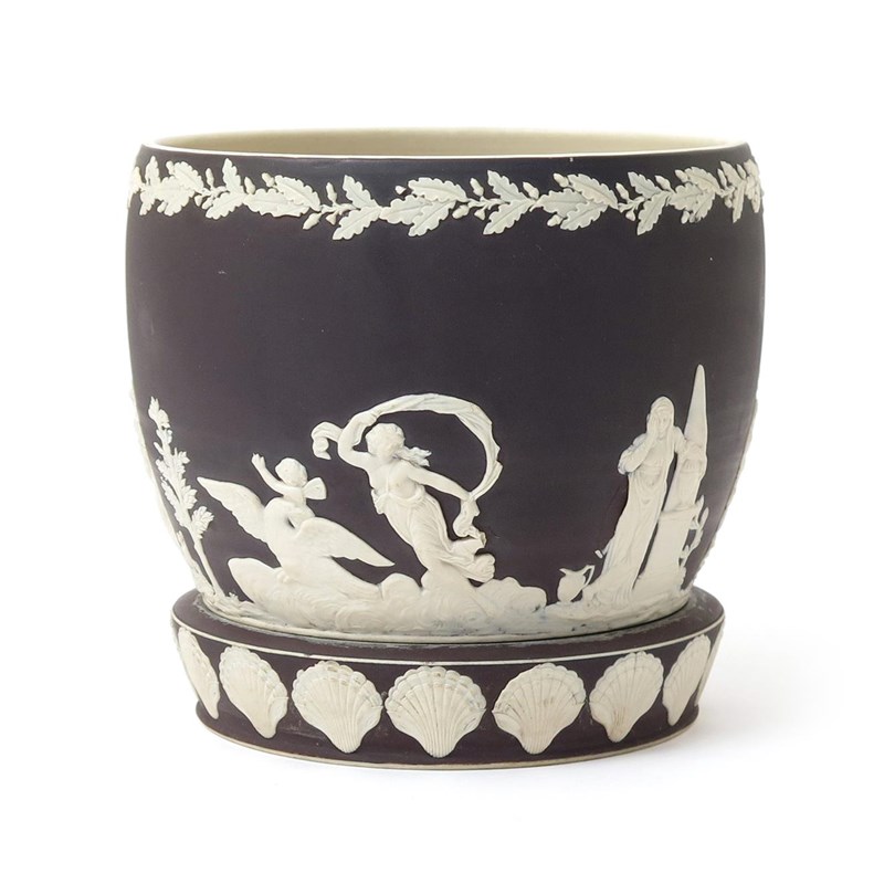 A Herculaneum Jasper dipped stoneware câchepot and stand early 19th century, applied with a continuous scene of Classical figures at various pursuits beneath a narrow band of oak leaves, the stand applied with scallop shells, all on a rich brown ground, impressed factory marks, 15.5cm high. (2)