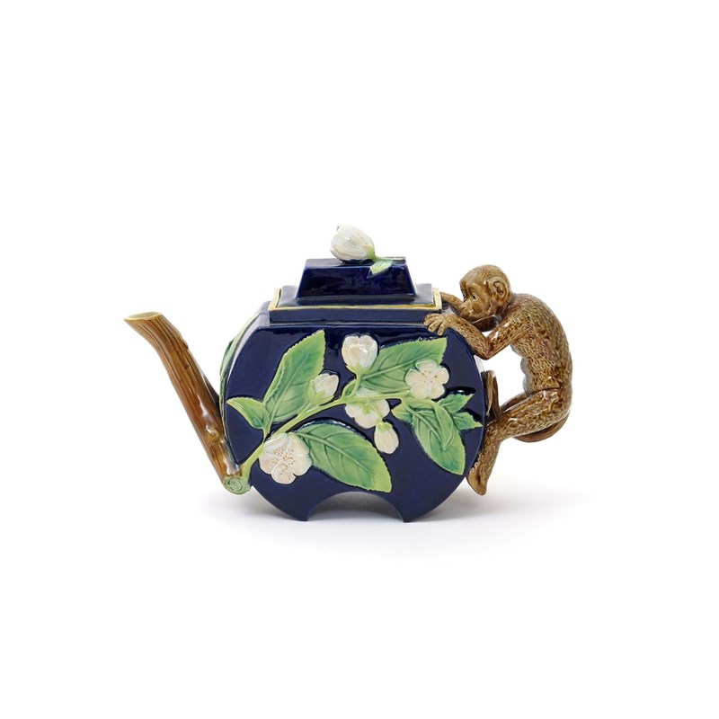 A George Jones & Son Majolica teapot and cover c.1875, modelled with a monkey clinging to the side of a flattened circular teapot applied with sprays of blossom on a blue ground, the interior glazed turquoise, moulded registration diamond, some good restoration to the spout, 24cm across. (2)