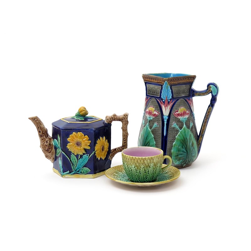 A Copeland Majolica jug c.1877, moulded with stylized panels of waterlily in the Aesthetic manner, a Majolica hexagonal teapot applied with bold yellow flowers, with a crabstock spout and handle, and a pineapple moulded cup and saucer, 20.5cm max. (5)