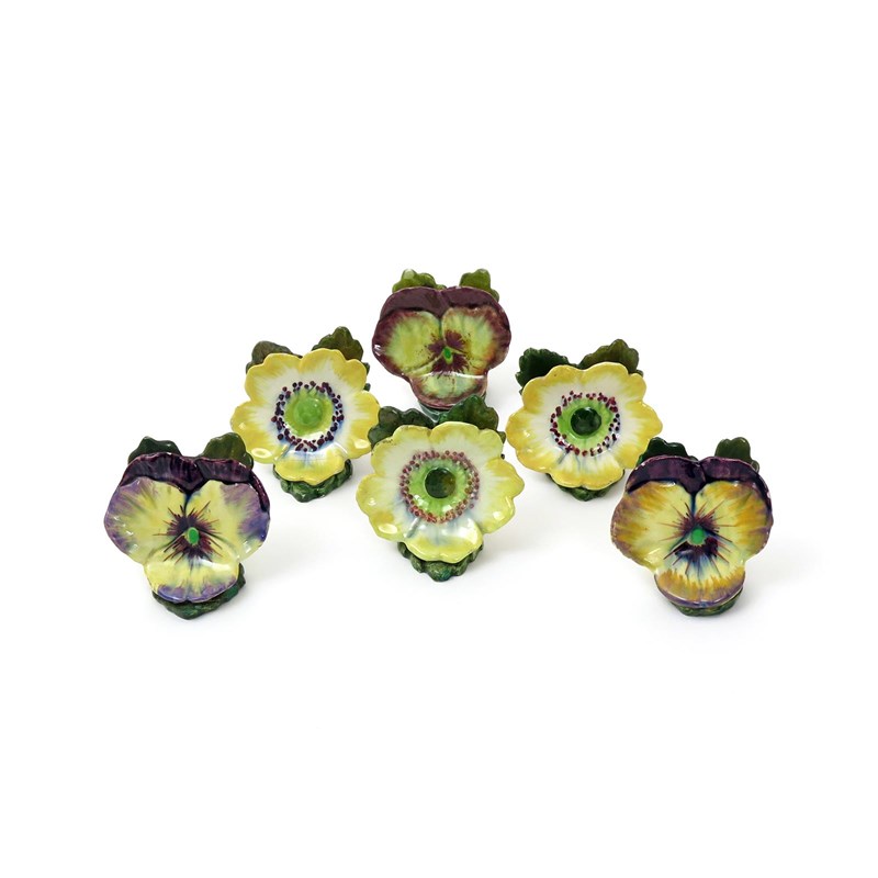 Six Continental Majolica menu holders late 19th/20th century, probably Delphin Massier, each modelled as a large flowerhead, three pansies and three peonies, some restoration, 7.5cm. (6)