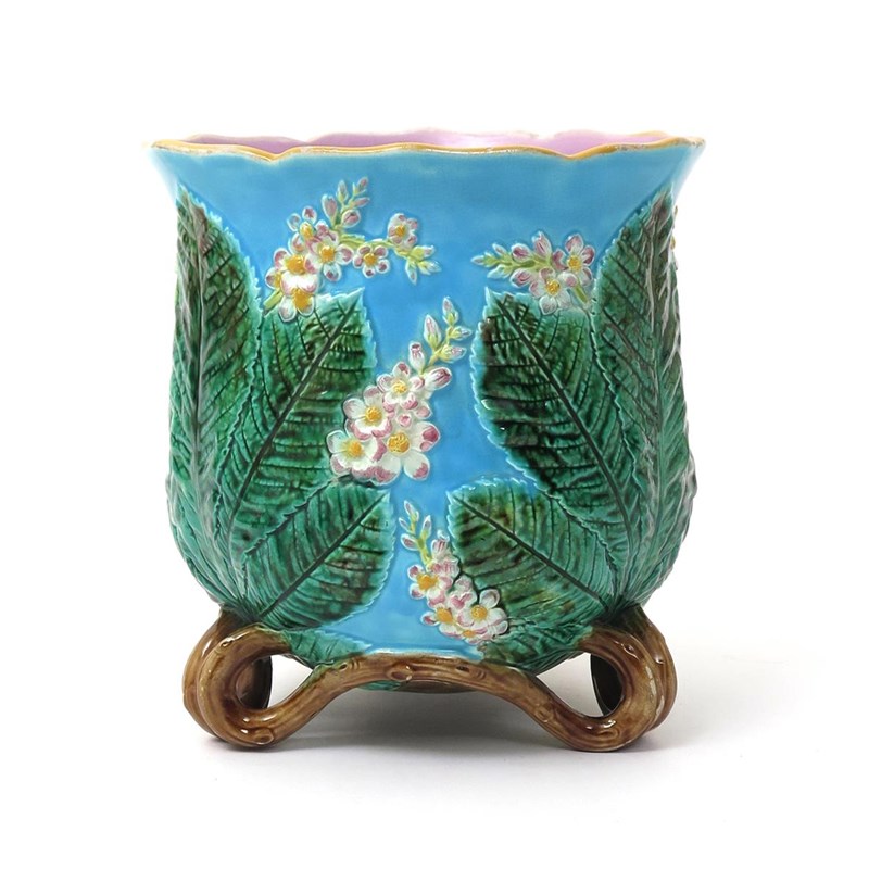 A George Jones Majolica jardinière c.1880, the rounded form moulded with sprays of blossom issuing from behind large chestnut leaves on a turquoise ground, raised on curved branch supports, the interior glazed pink, applied GJ monogram and Stoke-on-Trent mark, minor faults, 23cm.