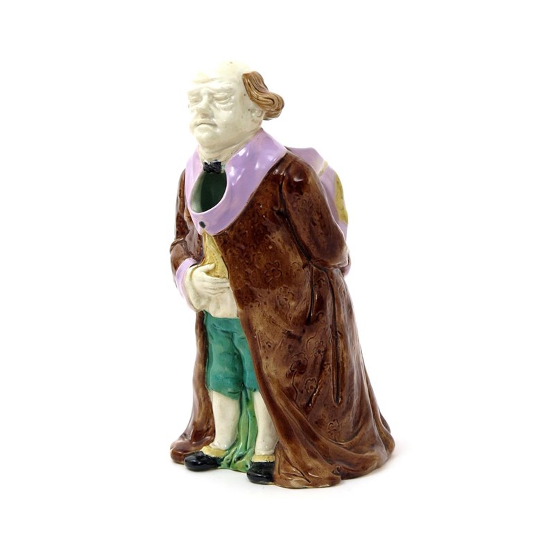 A Joseph Holdcroft Majolica figural jug or ewer 2nd half 19th century, modelled as a lawyer or judge, wearing a long brown coat, one hand resting on his stomach, the other holding a scroll behind his back, 27cm.