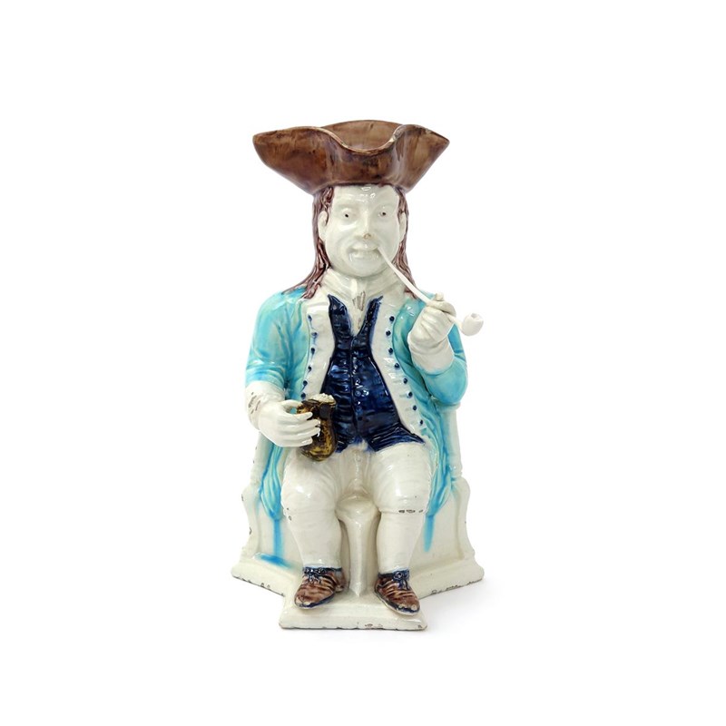 An unusual Squire Toby jug c.1810-20, seated on a shaped base and wearing a bright turquoise jacket over a blue waistcoat, holding a small jug of ale and a long-stemmed pipe, a little chipping, his pipe a replacement, 29.5cm.