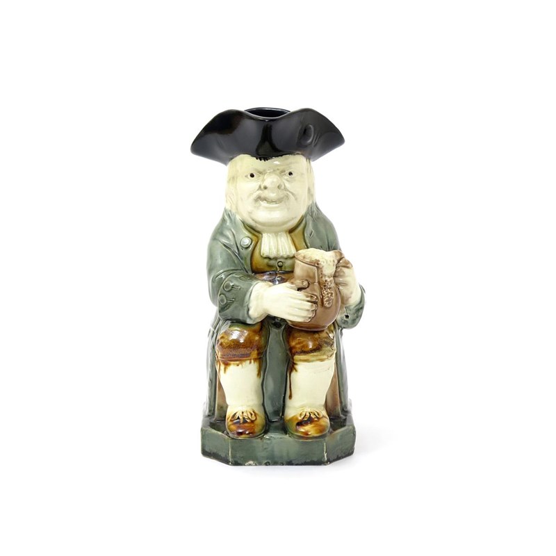A creamware Toby jug c.1790, seated with a large foaming jug of ale, his coat and breeches decorated in Whieldon type running glazes, some good restoration to the hat, 24cm.