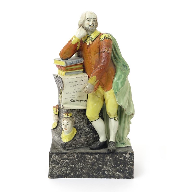 A large pearlware figure of Shakespeare c.1800, after Peter Scheemakers' version of William Kent's memorial, standing and resting his right elbow on a pile of books atop a plinth, his left hand pointing towards an unfurled scroll, wearing a green cloak over a red tunic and yellow breeches, raised on a tall rectangular faux marble base, small damages, 38.5cm.