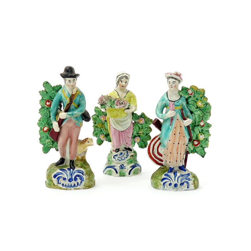 A pair of Staffordshire figures of a huntsman and a lady archer c.1830-40, he carrying a gun and with his dog at his side, she standing before a target and holding a bow and arrow, both standing before flowering bocage, and a similar pearlware figure of a girl holding a basket of flowers, all raised on rocky bases with scroll motifs picked out in blue, some damages, 14.3cm max. (3)