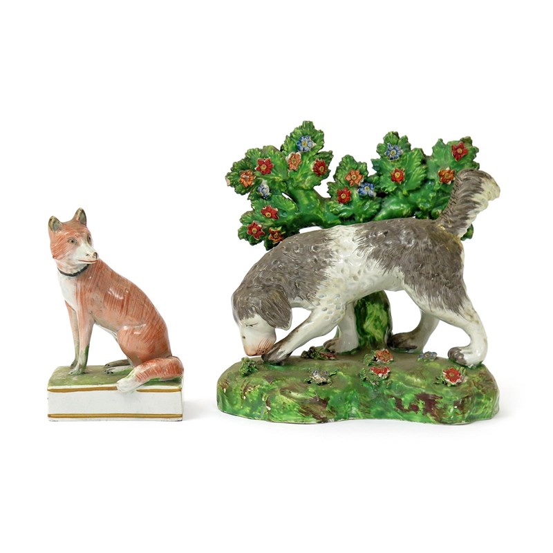 Two pearlware figures of animals early 19th century, one of a fox, wearing a collar and seated with its head turned to sinister, raised on a rectangular base, the other of a long-haired dog, sniffing a flower on a grassy base before flowering bocage, the dog's tail broken and restuck, 14.6cm max. (2)