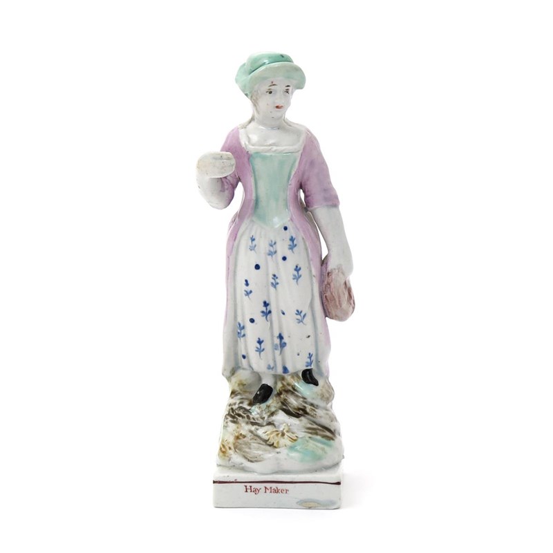 A Ralph Wood figure of a shepherdess early 19th century, standing on a rocky outcrop with her right hand extended to receive a staff, holding a small bag in her left, the square base misleadingly titled 'Hay Maker', decorated in pale pastel enamels, 16.5cm.