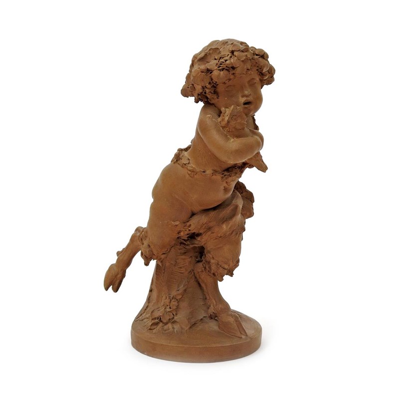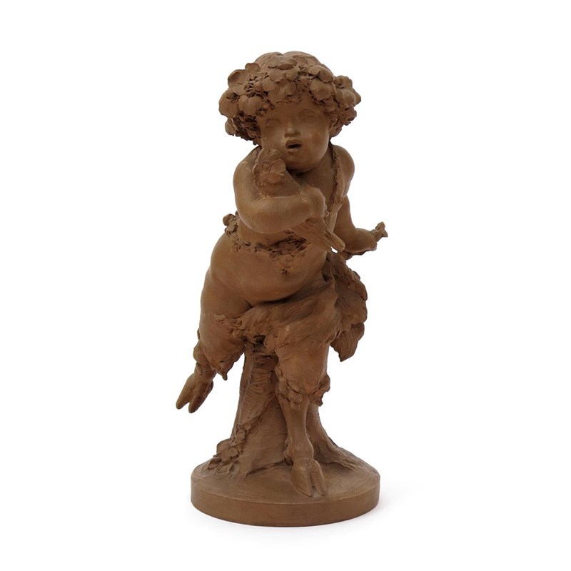 A French terracotta model of a running satyr c.1770, after Claude Michel known as Clodion (1738-1814), the youngster clutching an owl to his chest, wearing a crown of leaves, raised on a circular base, 27cm.