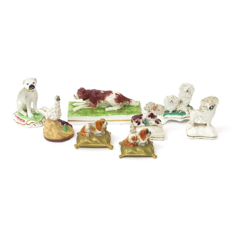 Seven small English porcelain figures of dogs most 1st half 19th century