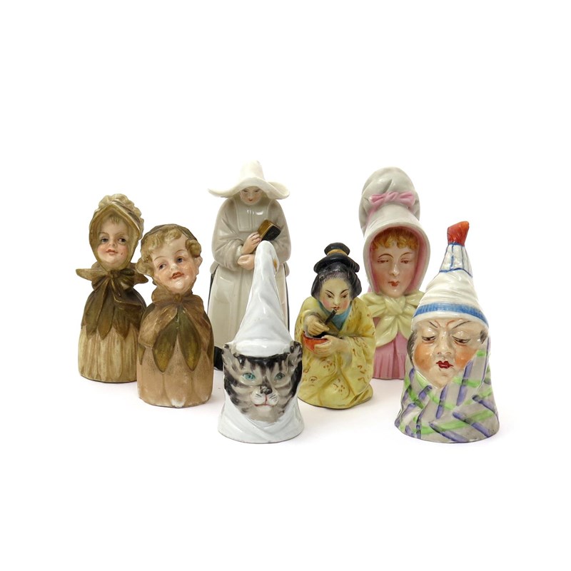 Four Royal Worcester candle snuffers late 19th and early 20th century, including Mr Caudle, the Young Girl, a nun and a kneeling Japanese girl, and three other English porcelain snuffers including a pair of children and a cat in a pointed night cap, 9cm max. (7)
