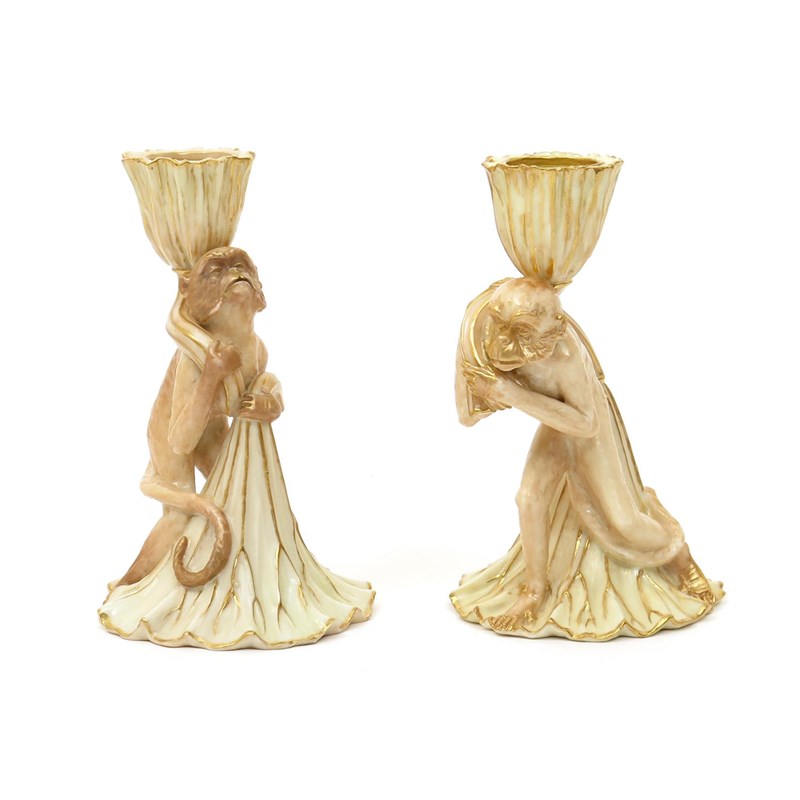 A rare near pair of Royal Worcester candlestick snuffers c.1887, each modelled as a monkey carrying a lotus pod, a smaller pod rising above him to form the candle sconce, the detailing picked out in gilt, printed mark to one, 13.3cm. (2)