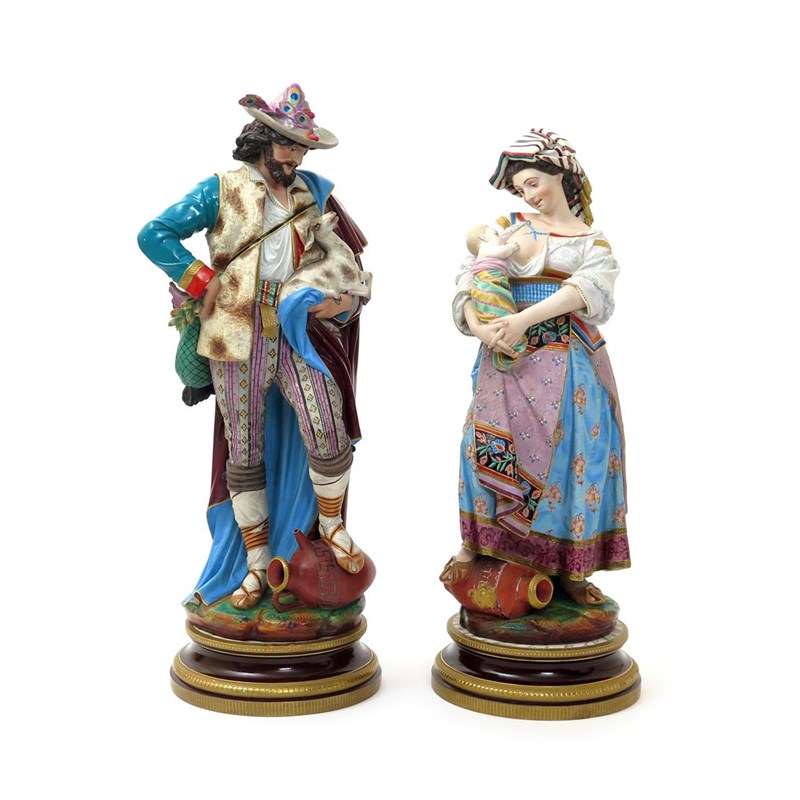 A massive pair of Continental porcelain figures of a goatherd and his companion late 19th/20th century, after A Carrier-Belleuse, each standing with one foot resting on an amphora or urn, he holding a young goat in his left arm, his companion breast-feeding her infant, with socle bases, some faults, 71cm max. (4)