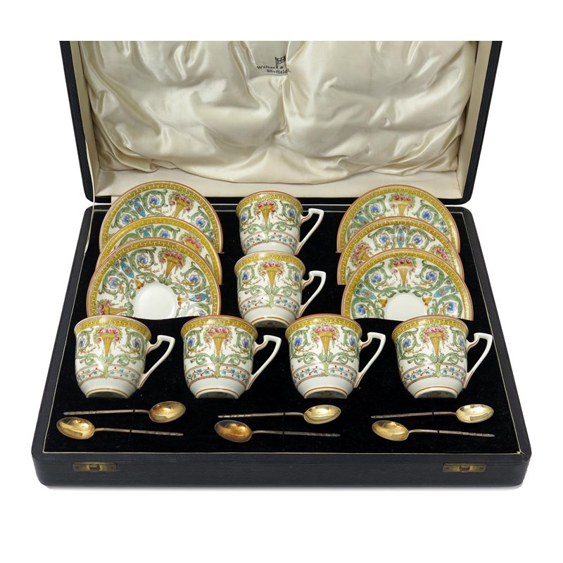A cased Royal Worcester coffee set date code for 1938, printed and hand-coloured with vases of roses amid foliate scrolls, the cups with angular handles. Comprising: six coffee cups, six saucers and six silver spoons, enclosed in a lined case for Walker & Hall of Sheffield.