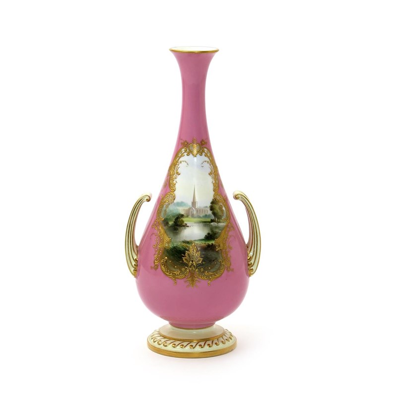 A Royal Worcester vase date code for 1902, of shape 2151, painted by Harry Davis with a view of Stratford Church, reserved in an elaborate gilt cartouche reserved on a pink ground, signed, printed marks, 28.3cm.