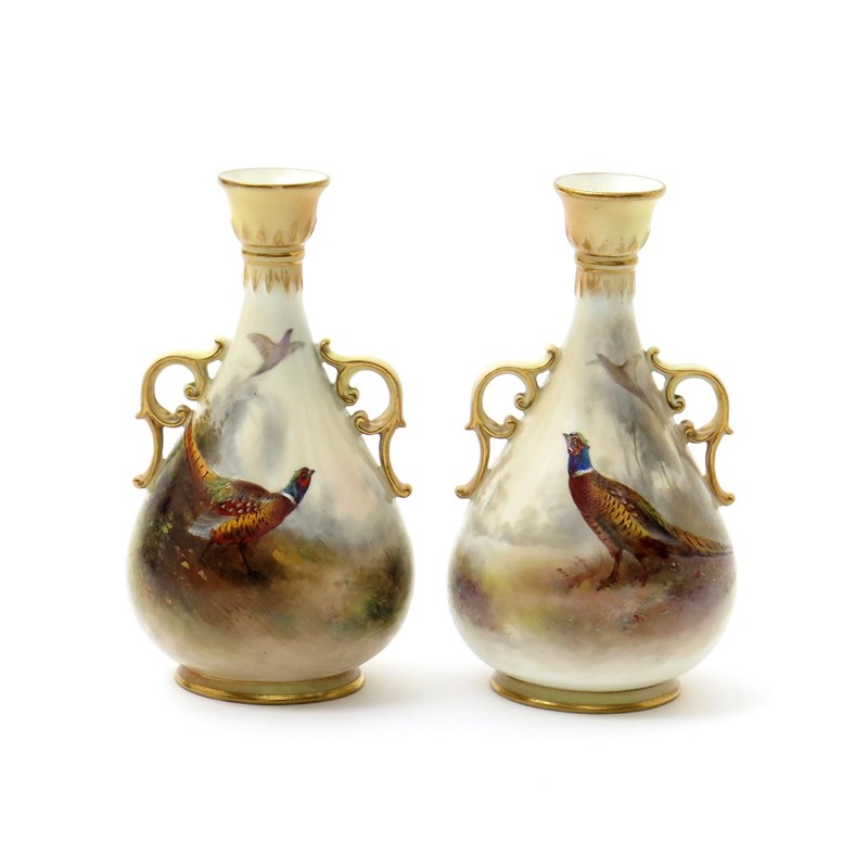A pair of Royal Worcester small vases date codes for 1903, painted by James Stinton each with a hen pheasant in flight above her partner standing in a wooded landscape, signed, the sides applied with scroll handles, printed marks, 14.7cm. (2)