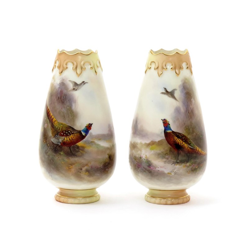 A pair of Grainger & Co (Worcester) small vases c.1901, of tapered form, painted by James Stinton each with a hen pheasant in flight above her partner standing in a wooded landscape, signed, the necks moulded with a fleur de lys border, printed marks, 13.5cm. (2)