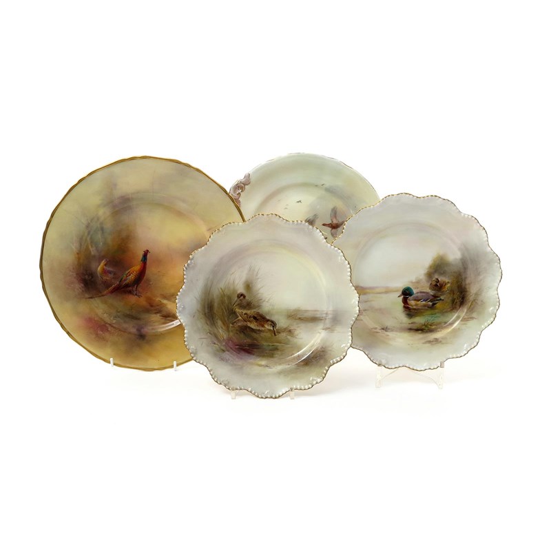 Four Royal Worcester plates date codes for 1913, 1928 and 1932, painted by James Stinton, a pair of plates with mallard ducks and other aquatic birds at the water's edge, one with a pair of pheasants in a woodland landscape, another with two grouse in flight above moorland, all signed, printed marks, some faults, 27.5cm max. (4)