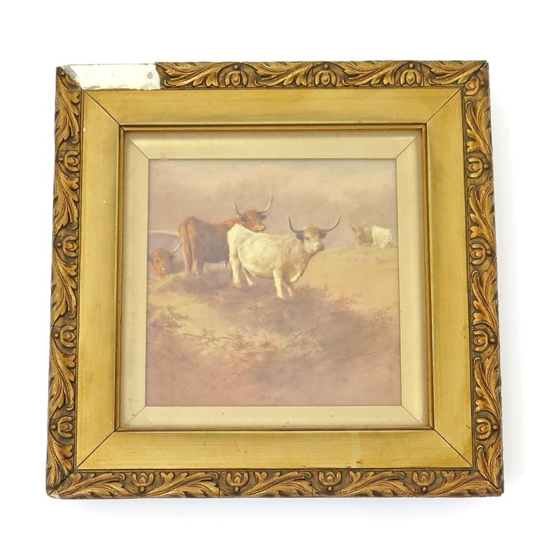 An English porcelain square plaque 19th/early 20th century, painted with a view of Highland cattle, signed 'F Hancock', mounted in a glazed gilt wood frame, the plaque 14cm.