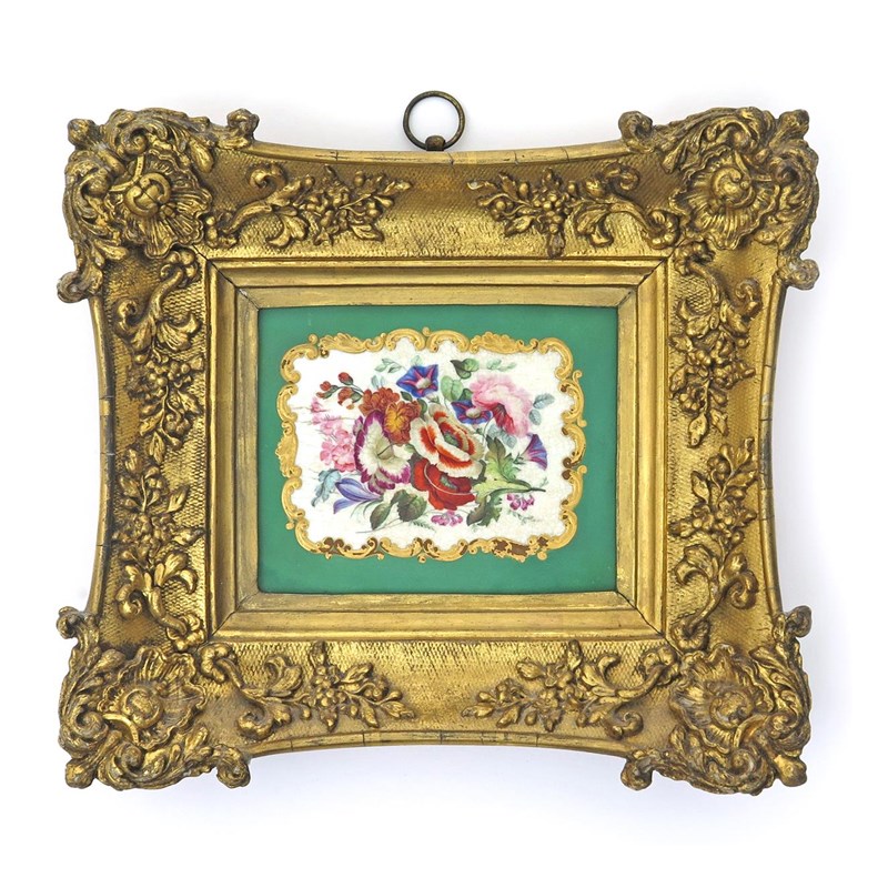 A small Derby rectangular plaque c.1830, painted with a floral arrangement including rose, convolvulus and poppy, reserved in a scrolling gilt cartouche on an apple green ground in the Sèvres style, crowned interlaced LL mark, in a gilt wood frame, some crazing, the plaque 10cm x 12cm.