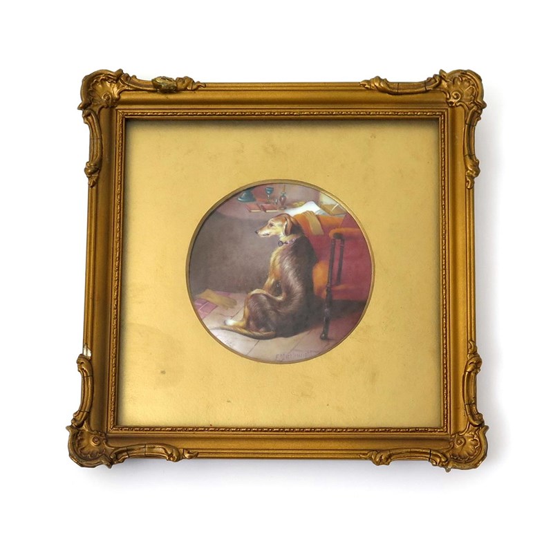 An English porcelain circular plaque 20th century, painted with a dog leaning against an armchair with a glove on the floor beside him, signed 'F Micklewright', in a glazed gilt wood frame, the plaque 11.5cm.