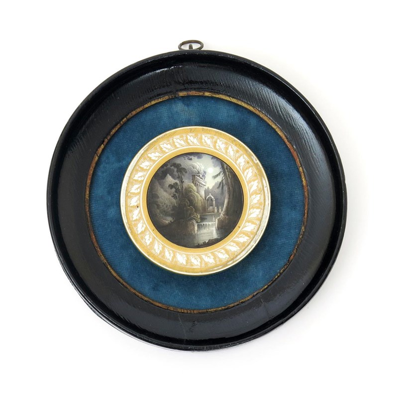 An English porcelain circular plaque or box lid 1st half 19th century, finely painted with the moon shining above a waterfall cascading down from Classical ruins, within a continuous gilded leaf border, the edge glazed a deep green, mounted on velvet in a wooden frame, the plaque 8.5cm.